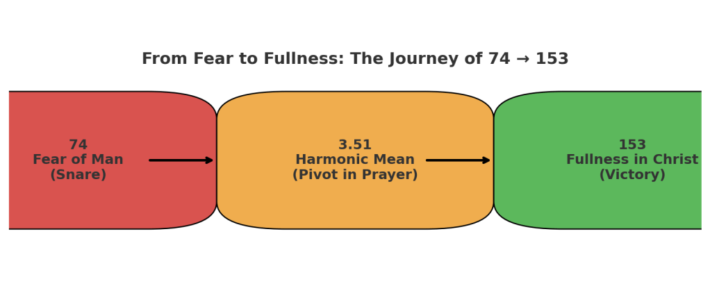 This shows that the fear of man (74) is not overcome by willpower, but by stepping into the victory of Christ (153), made present through the Lord’s Prayer. The journey of numbers thus becomes the journey of the soul: from fear → to fullness, from snare → to deliverance, from 74 → 153.