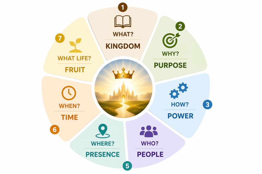 This order is helpful because it moves from the nature of the Kingdom, to its purpose, to its operation, to its people, to its place, to its timing, and finally to the kind of life it creates.